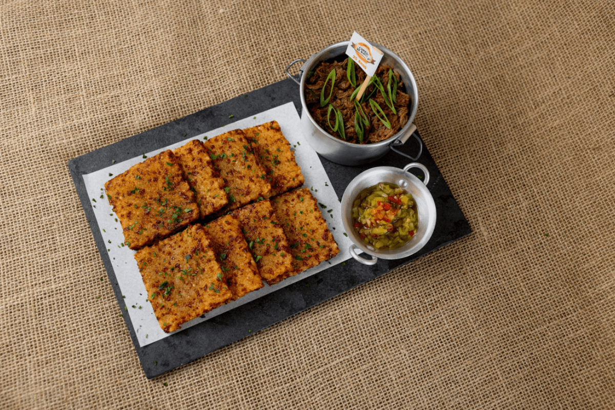 Distrito 43 Gastrobar: Fraldinha com snack de tapioca e queijo coalho (Fraldinha desfiada ao molho com snack crocante de tapioca e queijo coalho, acompanha molho de conserva de pimentas). Endereço: Avenida Garibaldi Deliberador, 800